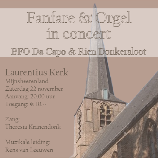 Op zaterdag 22 november geeft Da Capo een bijzonder concert samen met organist Rien Donkersloot en zangeres Theresia Kranendonk. Bent u benieuwd hoe dat klinkt: fanfare, kerkorgel en zang, kom dan luisteren in de Laurentius kerk in Mijnsheerenland.